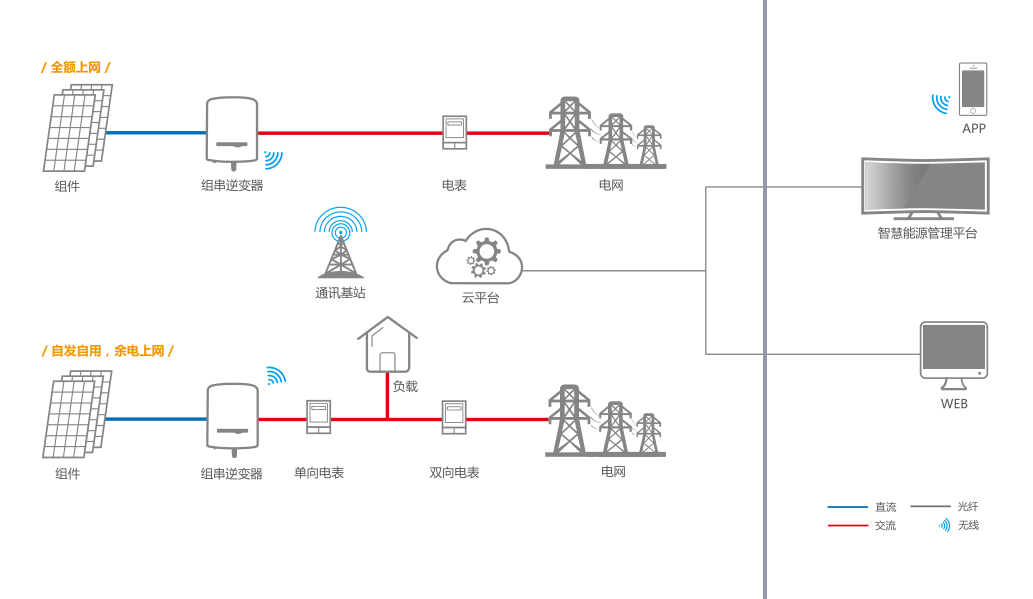 - 逆變器與手機(jī)等終端可通過GPRS/WiFi等方式互聯(lián),針對(duì)農(nóng)村戶用系統(tǒng)優(yōu)先推薦GPRS通信方案